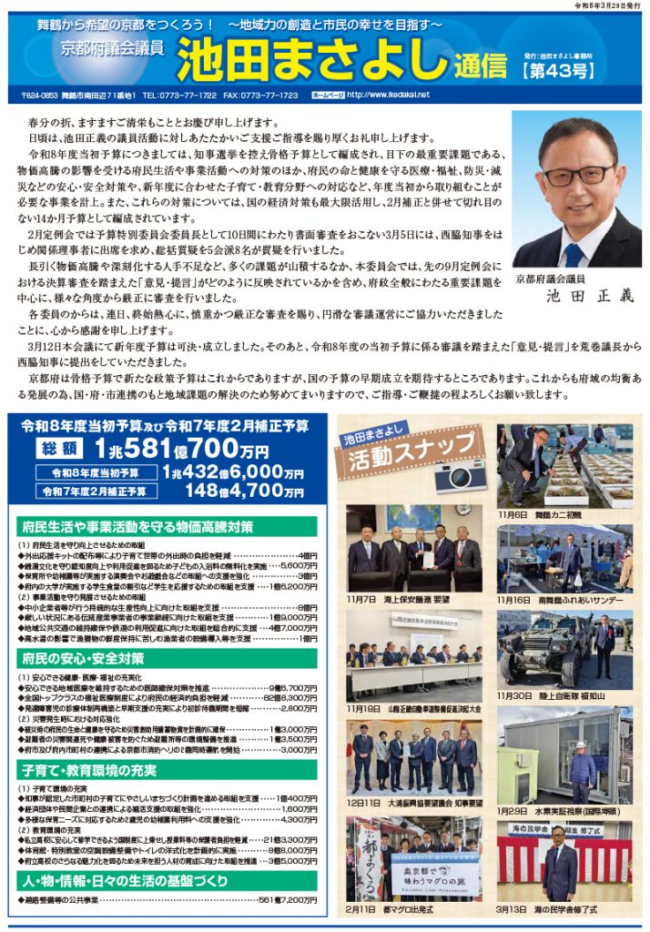 池田まさよし通信第43号を追加しました。 メニューの「池田まさよし通信」よりダウンロード下さい。